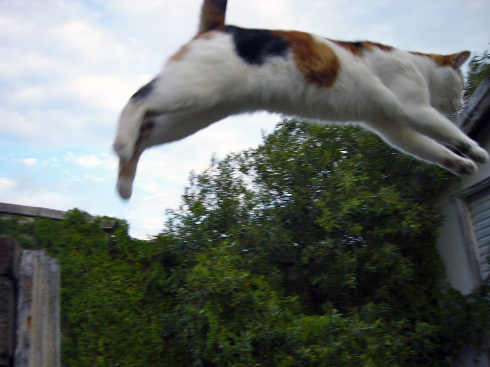The next shot is kinda scary. Tootie was able (at that time in her life) to get up and down from the roof by jumping onto a low brick wall in our backyard. She did this every day, time after time, and we often heard her running around on the roof at night.